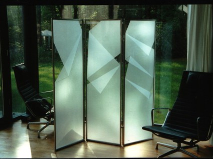 Dabei sind sie sehr variabel aufzustellen. Sie teilen Räume, ohne zu trennen, lassen neue Situationen entstehen, neues Raumgefühl erleben. Die Einzelelemente sind vollständig zueinender drehbar und leicht trennbar. Die Glas-Oberflächen sind mit Sandstrahl bearbeitet. Die Rahmen sind aus Edelstahl oder auch Stahl im Rostlook. Sie sind auch im Außenbereich variabel benutzbar als Windschutz oder Sichtschutz, auch als Sonnenschutz.